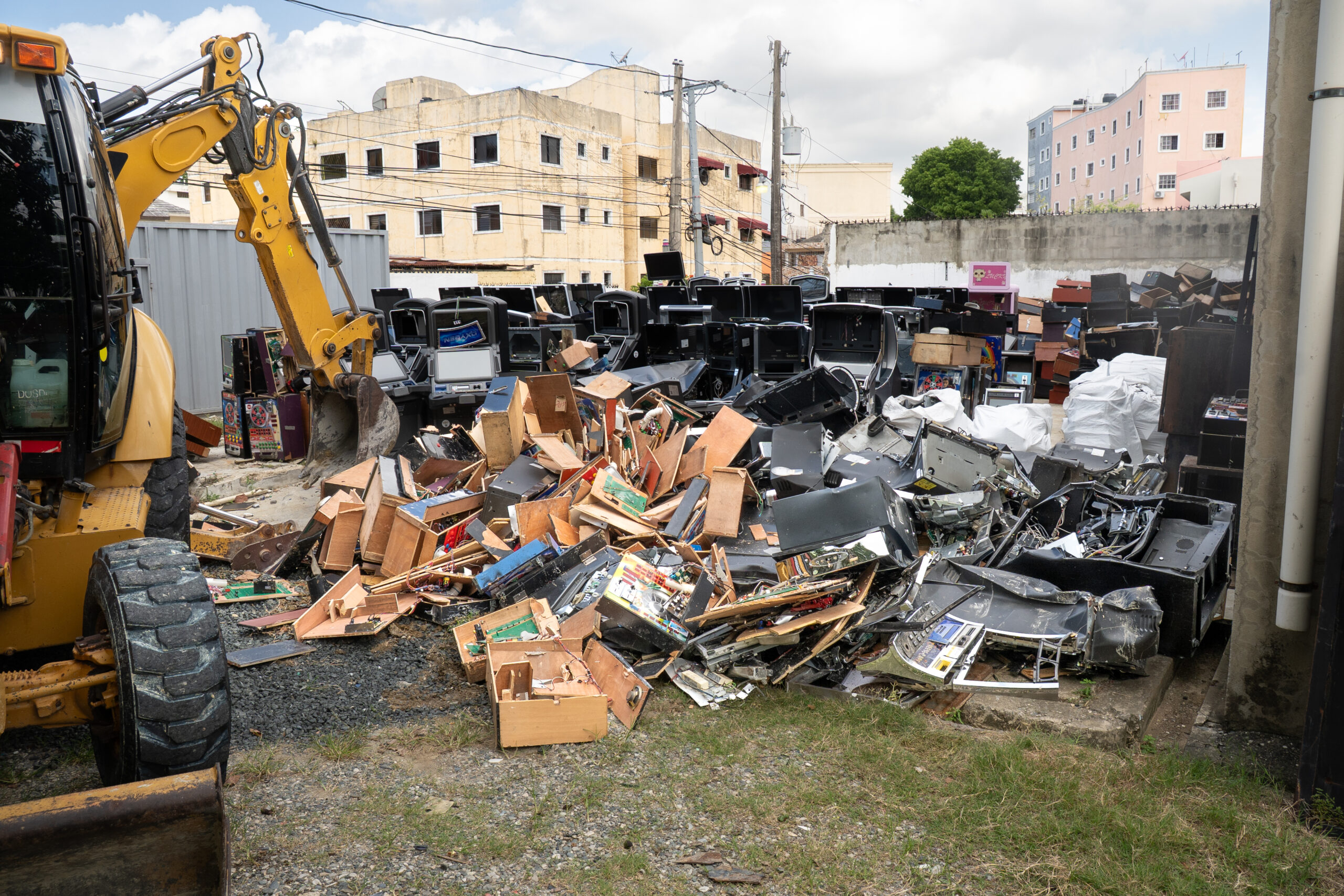 Santo Domingo.- El Ministerio de Hacienda, a través de su Dirección de Casinos y Juegos de Azar (DCJA), destruyó este viernes 1,556 máquinas tragamonedas, dispositivos electrónicos y otros equipos decomisados por la institución, debido a estar instalados de manera ilegal en locales no autorizados y a su empleo en la venta ilegal de loterías.